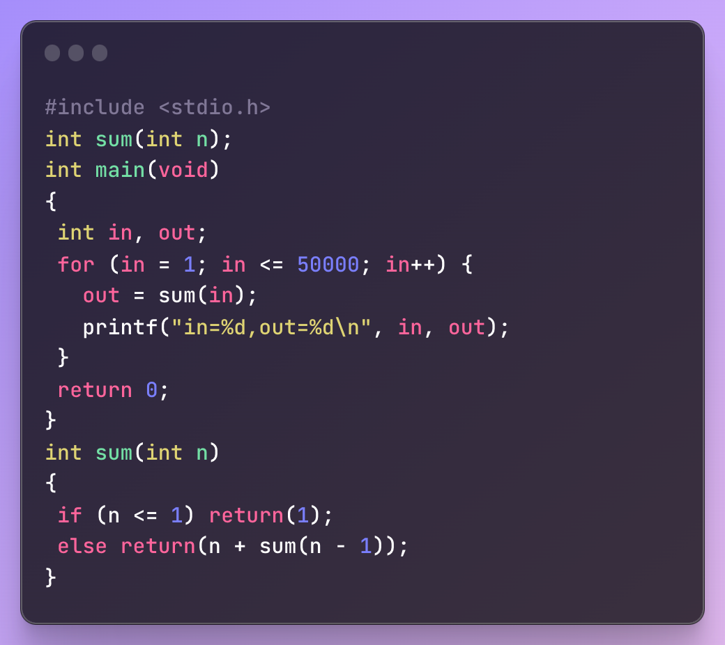 (7행: 6행의 in값에 따라 sum()함수가 재귀호출을 하므로 자기 자신을 반복해서 호출하게 되는데 실행결과를 보면 in이 4790일 때까지는 정상적으로 수행하지만 그 다음부터는 오류 메시지도 없이 프로그램 살행이 중단된다. 이것을 재귀호출에 의한 스택 오버플로우라한다.)