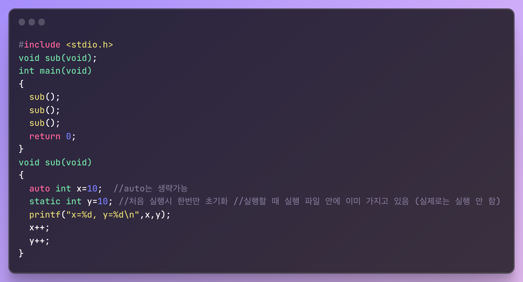 3. 기억클래스가 명시되지 않고 선언된 변수는 모두 자동 변수이다. 즉, auto는 생략이 가능하다. 그래서 지금까지 기억클래스를 쓰지 않고 사용한 모든 변수는 auto변수이다.