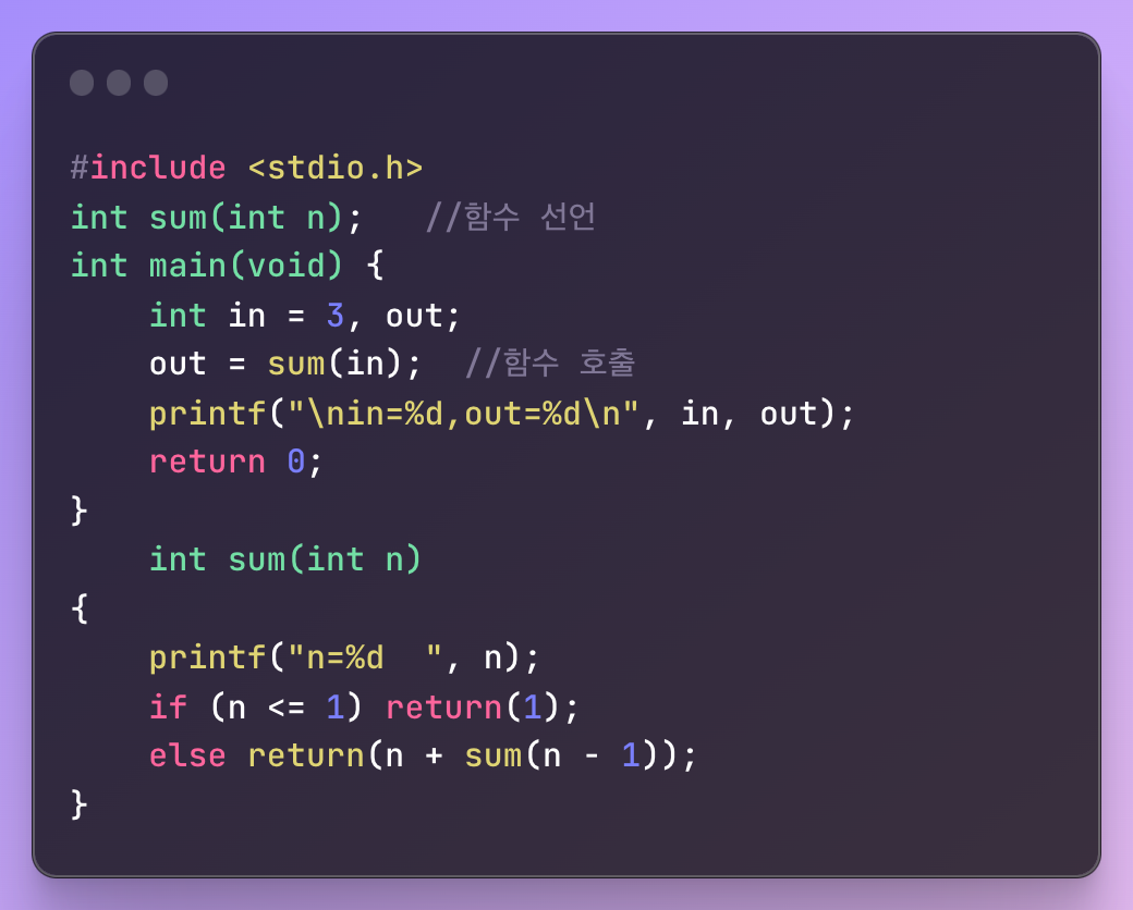 재귀 호출을 허용하는 함수를 재귀 함수라고 하며 구현하고자 하는 작업이 함수 자신을 순환 반복하여 구현되어질 수 있다면 재귀함수를 이용할 수 있다.