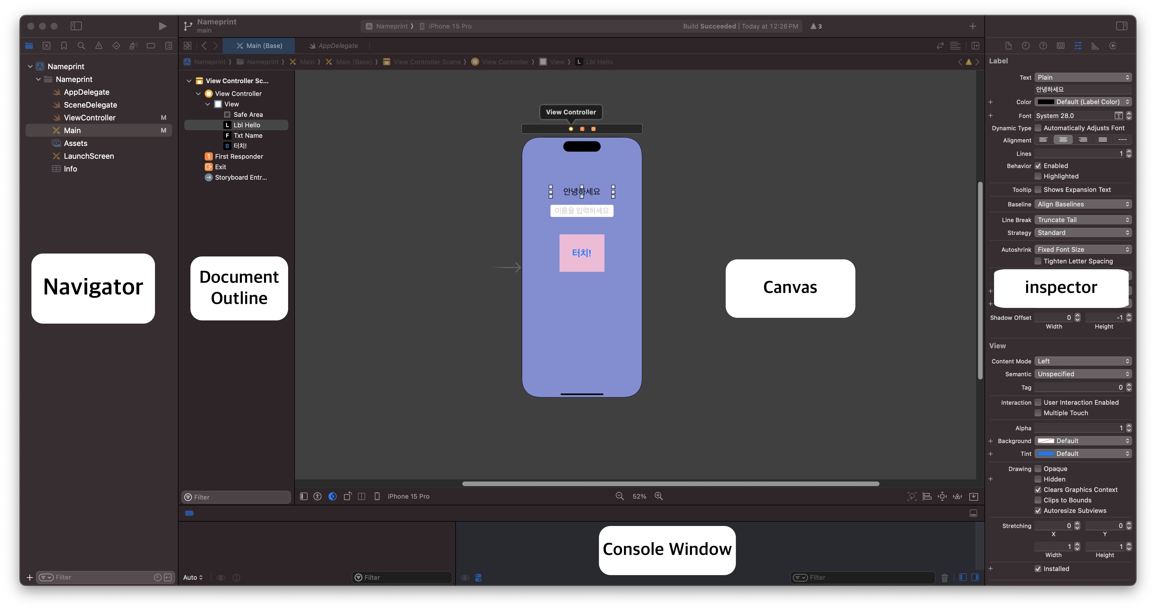 Console Window : Xcode의 디버깅 과정에서 사용되는 영역입니다. 이 영역은 애플리케이션의 실행 중에 출력되는 로그 메시지, 디버그 정보 및 에러 메시지 등을 표시합니다. 주로 개발자가 애플리케이션 동작을 분석하고 디버깅하는 데 사용됩니다.