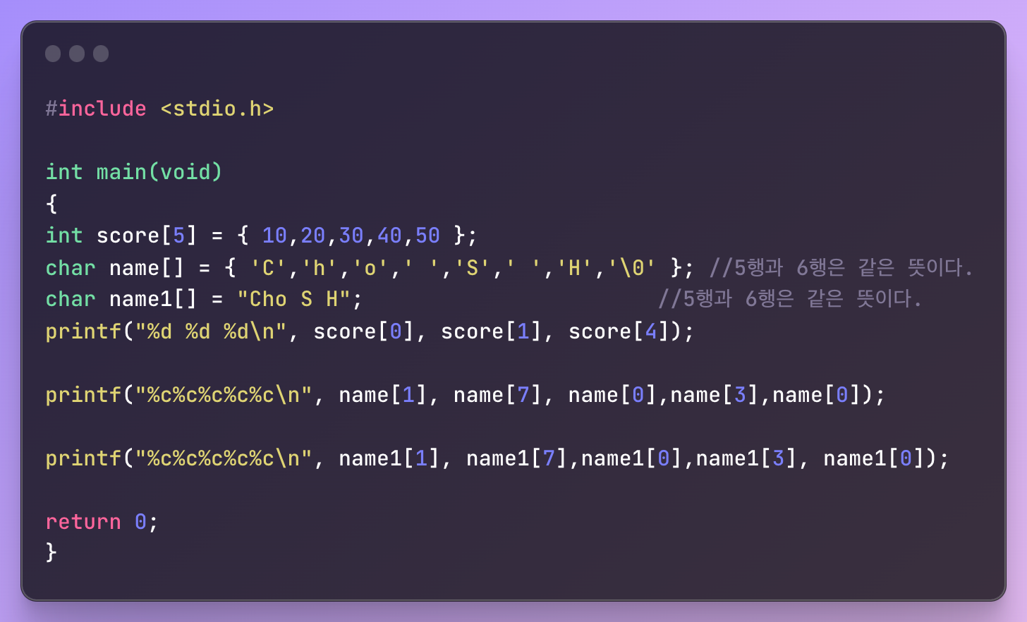 -int cho[3]={10,20,30}; // 배열 선언과 초기화