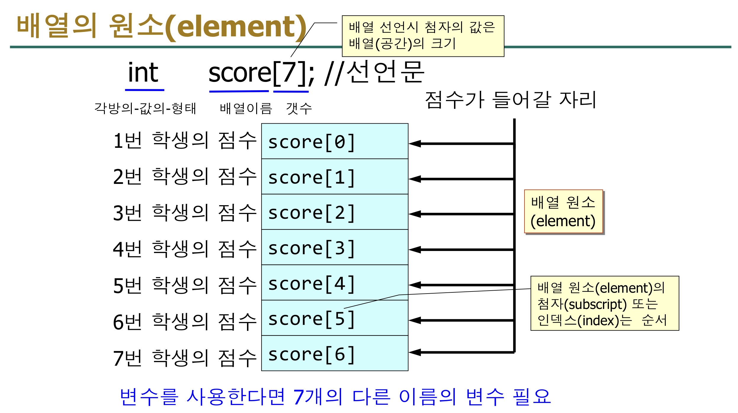 score배열은 정수형 자료 7개를 저장할 수 있다. 7개의 공간을 배열의 배열의 원소(element)라고 한다.