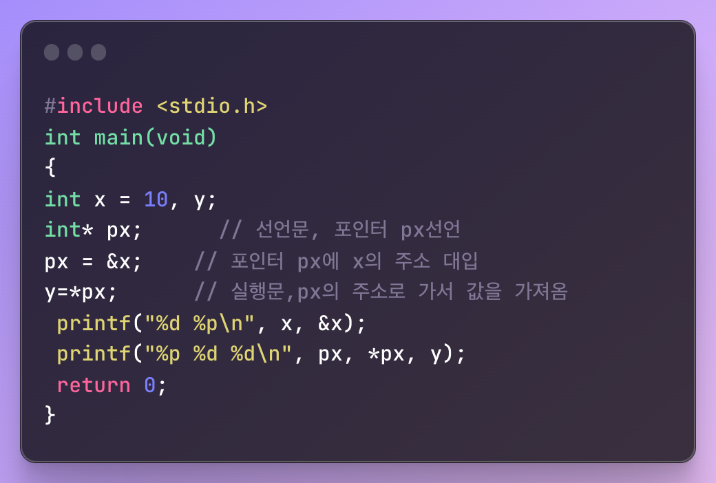 | int x=10; //일반 변수 x의 선언과 초기화 int *px; //포인터 변수 px선언 int=&x; //포인터 px에 변수 x의 주소 대입 |