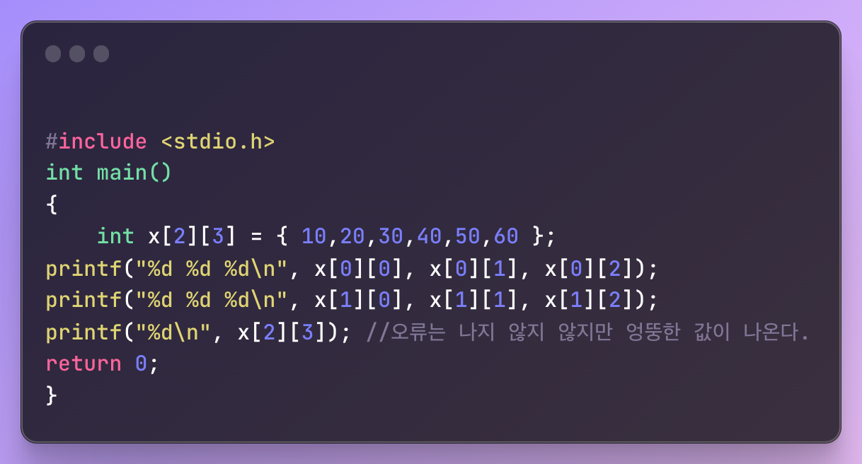 2차원 배열도 물리적으로는 1차원적으로 저장한다. 배열의 전체 크기는 선언시 사용한 첨자를 곱(3x2)하면 되고 마지막 원소는 x[3][2]가 아니라 x[2][1]인 것을 주의!