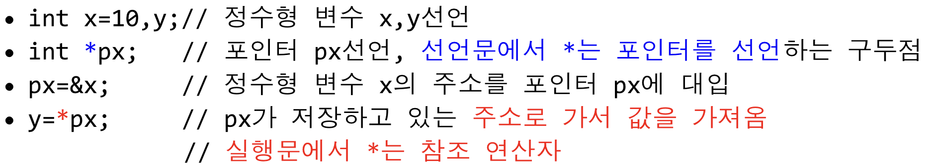 | -intx; //일반 변수 x의 선언 -int *x; //포인터 (변수) x의 선언 -int* px; //포인터 px의 선언 -int *px, y; //px만 포인터, y는 일반 변수 -int*px,*py; //px, py 둘 다 포인터 |