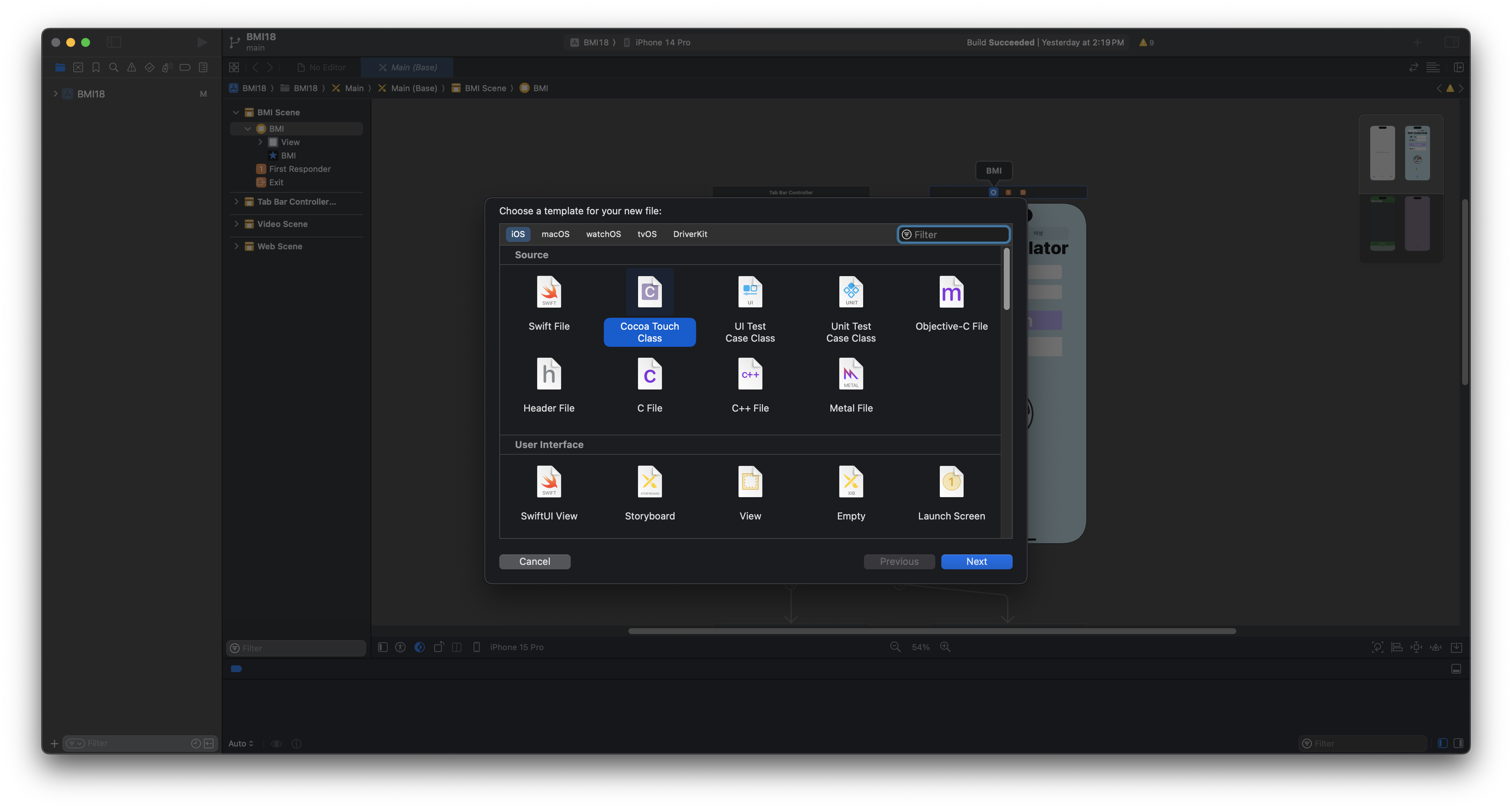여기에서 Cocoa Touch Class를 선택해주고