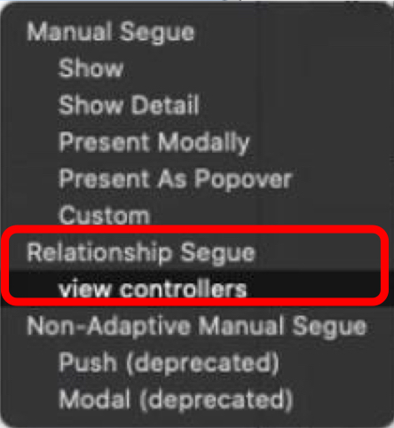 연결하는 방법은 Tab Var Controller에서 새로 만든 View Controller로 Control키를 누르면서 드래그를 하고 버튼을 떼면 나타나는 검은 창에서 RelationShip Segue - view controllers를 선택해주면 됩니다.