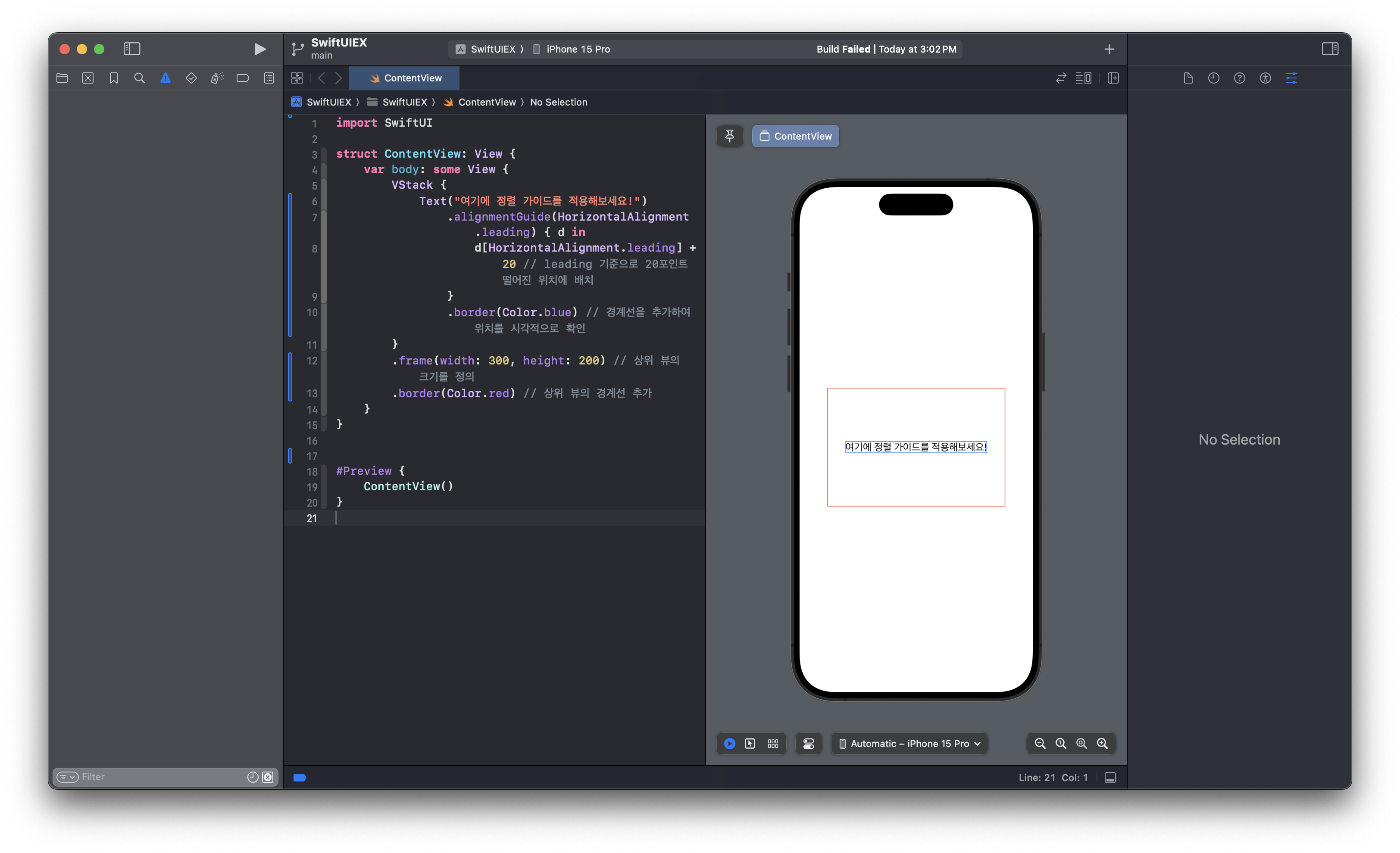 이 코드는 Text 뷰를 VStack의 leading에서 20포인트 더 떨어진 위치에 정렬하는 예제입니다. alignmentGuide() 수정자 내부에서 클로저를 사용하여 뷰의 정렬 위치를 계산하고 있습니다. 뷰의 경계선을 추가하여 정확한 위치를 시각적으로 확인할 수 있게 해주었습니다.