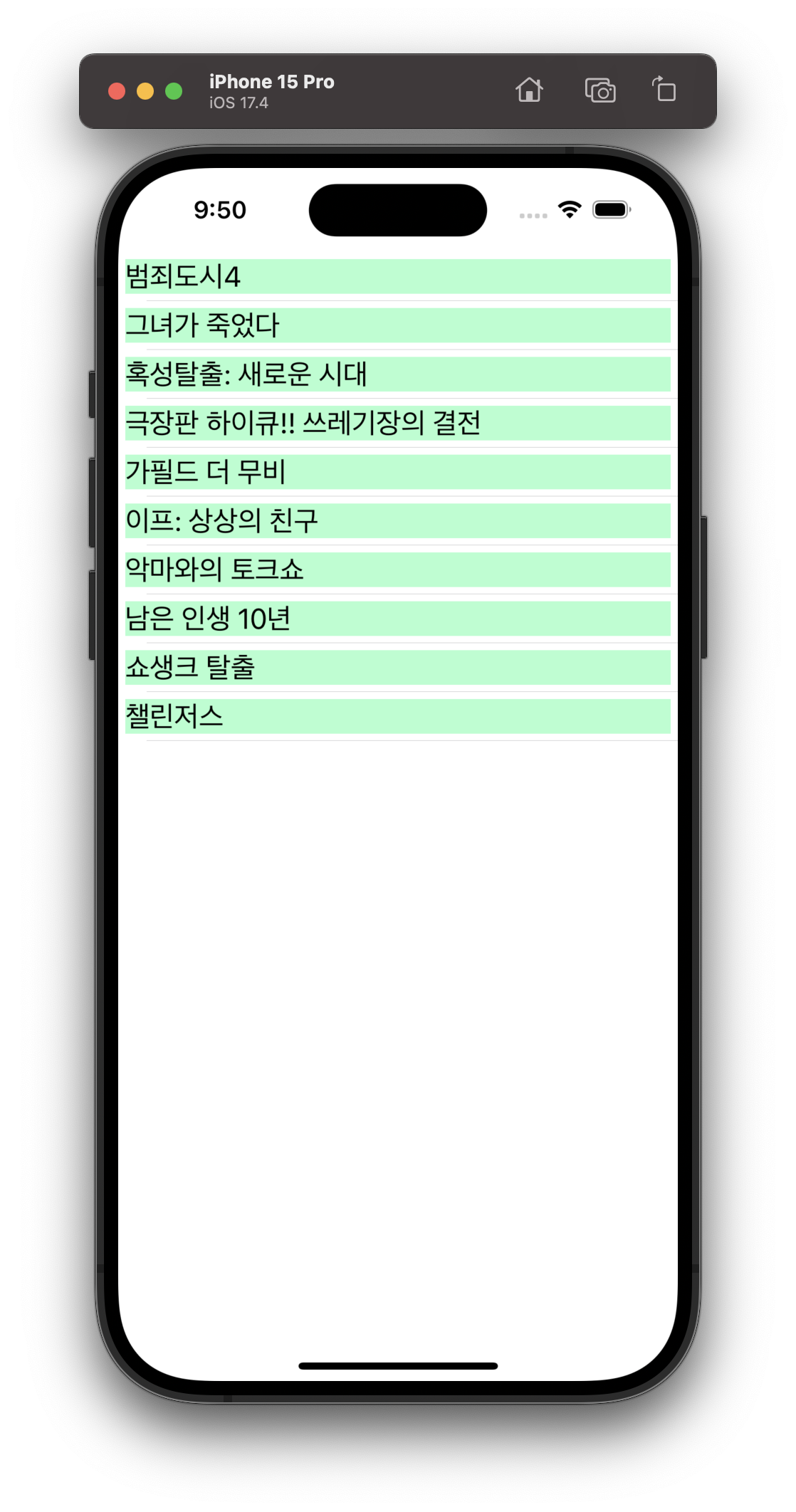 print("First movie name: \(decodedData.boxOfficeResult.dailyBoxOfficeList[0].movieNm)") // Debug