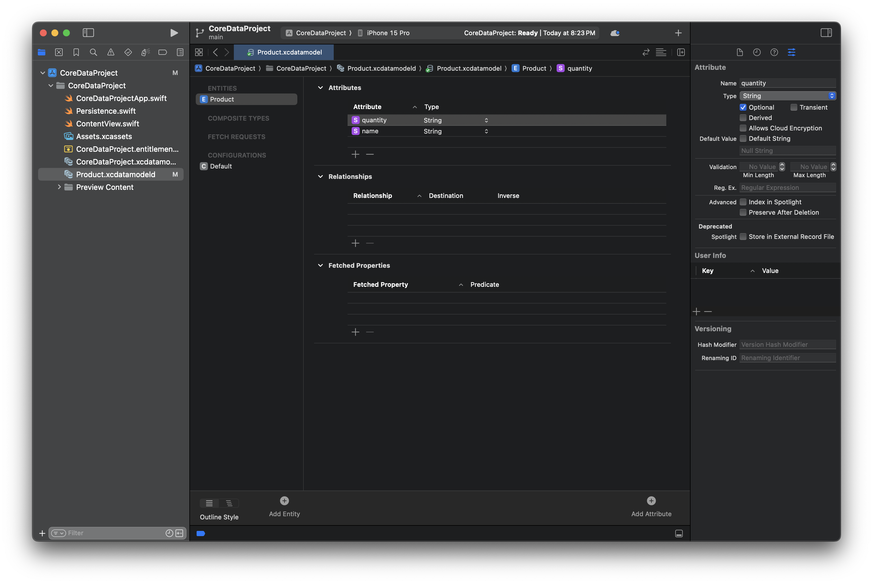 이렇게 엔티티가 생성되었으면 이제 이름과 수량 속성을 추가해주겠습니다. 첫 번째 속성을 추가하기 위해 메인 패널에서 Attributes 아래에 + 버튼을 눌러서 이름은 name 타입은 String으로 설정한 속성과 quantity라는 이름과 String타입을 가진 속성을 추가하겠습니다.