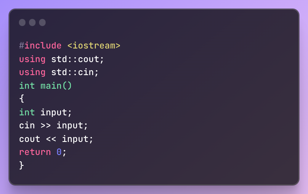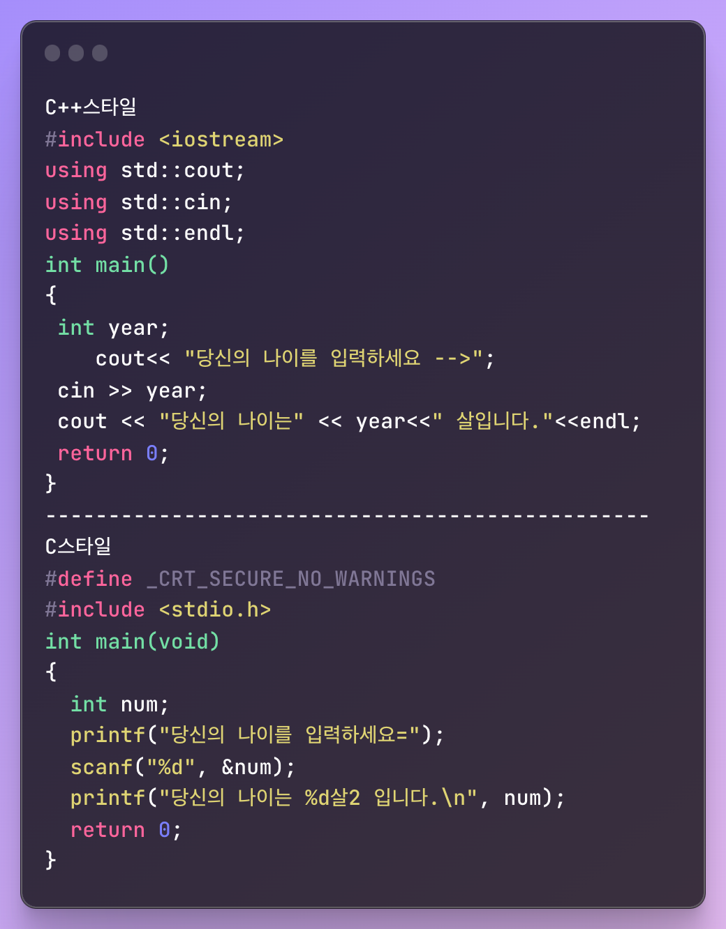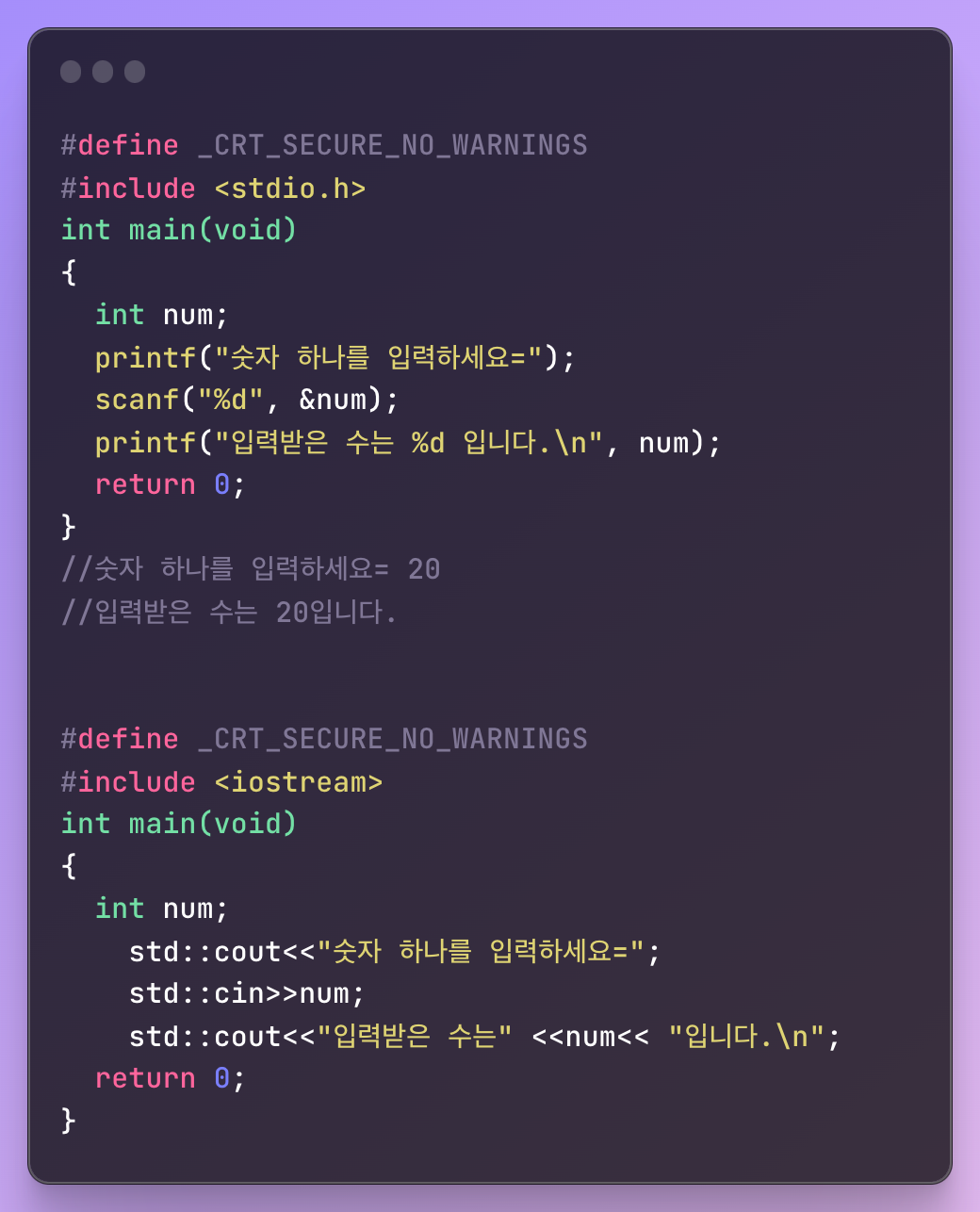 - cin - 키보드로부터 데이터를 입력 받는 객체로 C언어에서 scanf()와 같은 역할이다.