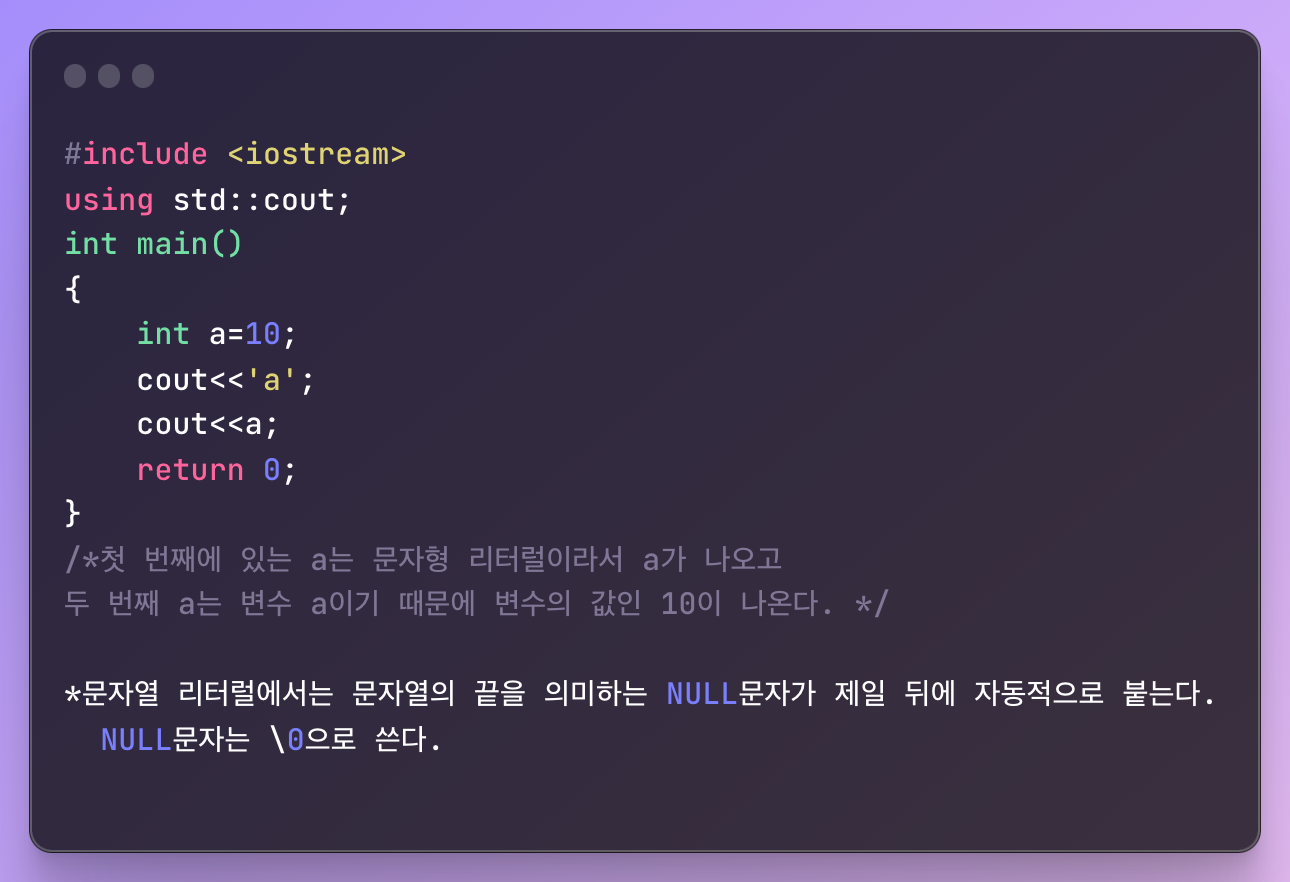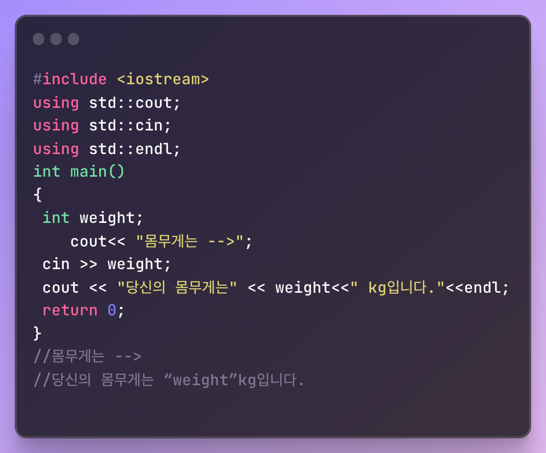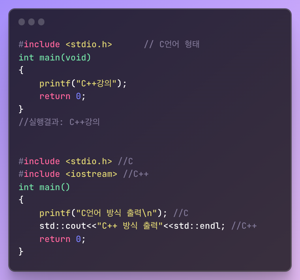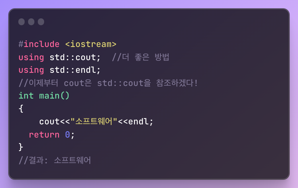 - cout - 화면으로 출력하는 객체로 C언어에서 printf()와 같은 역할을 한다.