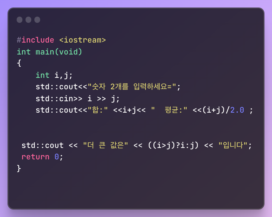 2.5 숫자 2개를 입력 받고 합과 평균, 더 큰 값을 구하는 예제