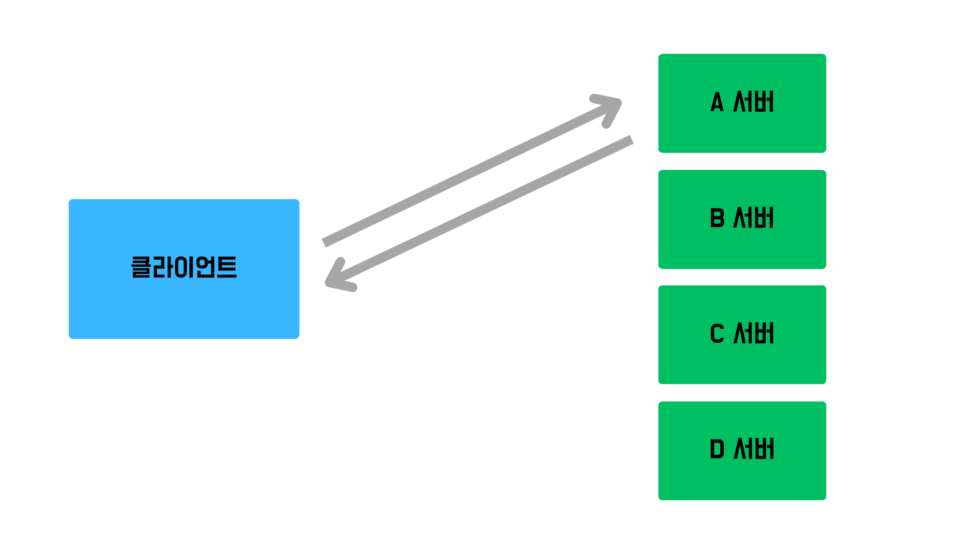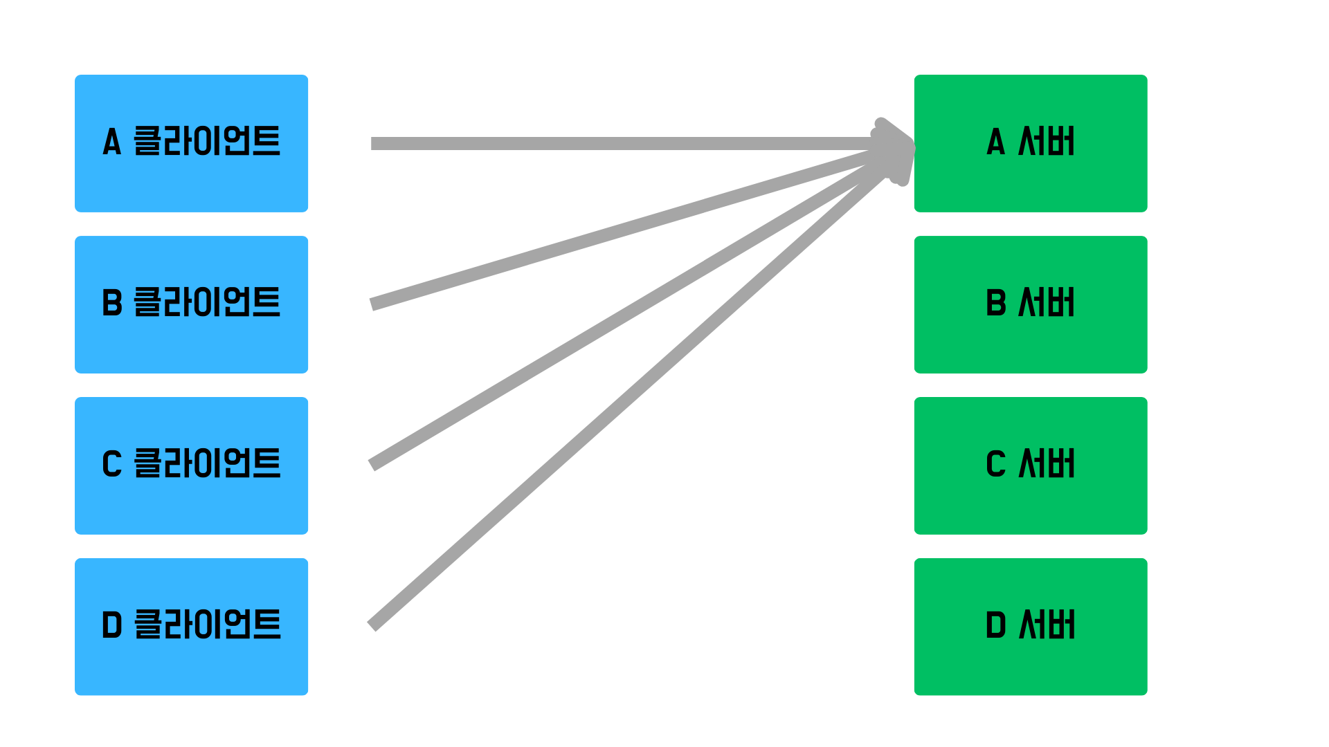 이렇게 A, B, C, D 여러 대의 클라이언트가 존재할 때 이 클라이언트들이 하나의 서버에 동시다발적으로 접속하게 되면 A 서버는 과부하가 오게 되는데 해당 클라이언트들의 정보를 기억하는 건 A 서버 밖에 없으니 A 서버에 접속할 수밖에 없습니다.