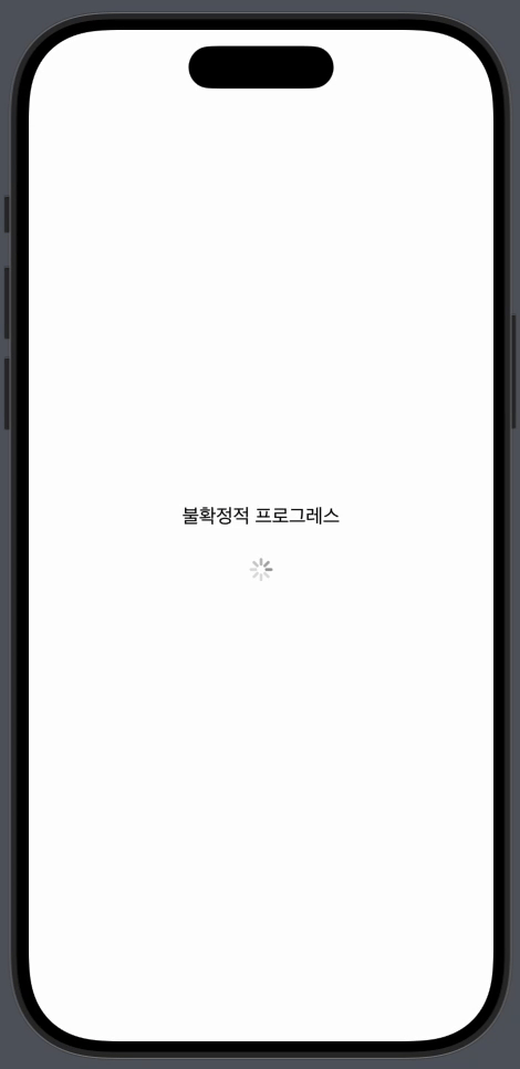 불확정적 스타일은 이런 식으로 만들 수 있는데 스피닝 인디케이터(spinning indicator)를 표시하고 진행률을 나타내는 값 바인딩을 포함하지 않고 ProgressView를 사용하여 선언됩니다.