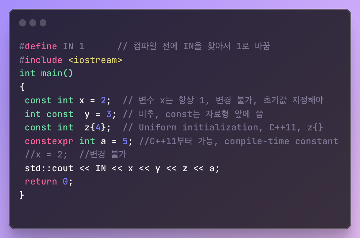 - 변수에 const라는 키워드를 사용하여 상수(constant)의 의미를 갖게 하여 그 내용을 변경할 수 없게 한다.