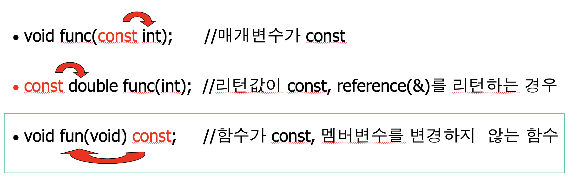 - const형을 선언하고자 하면 멤버변수는 형 앞에 const를, 멤버함수는 함수의 괄호 다음에 const를 추가한다.