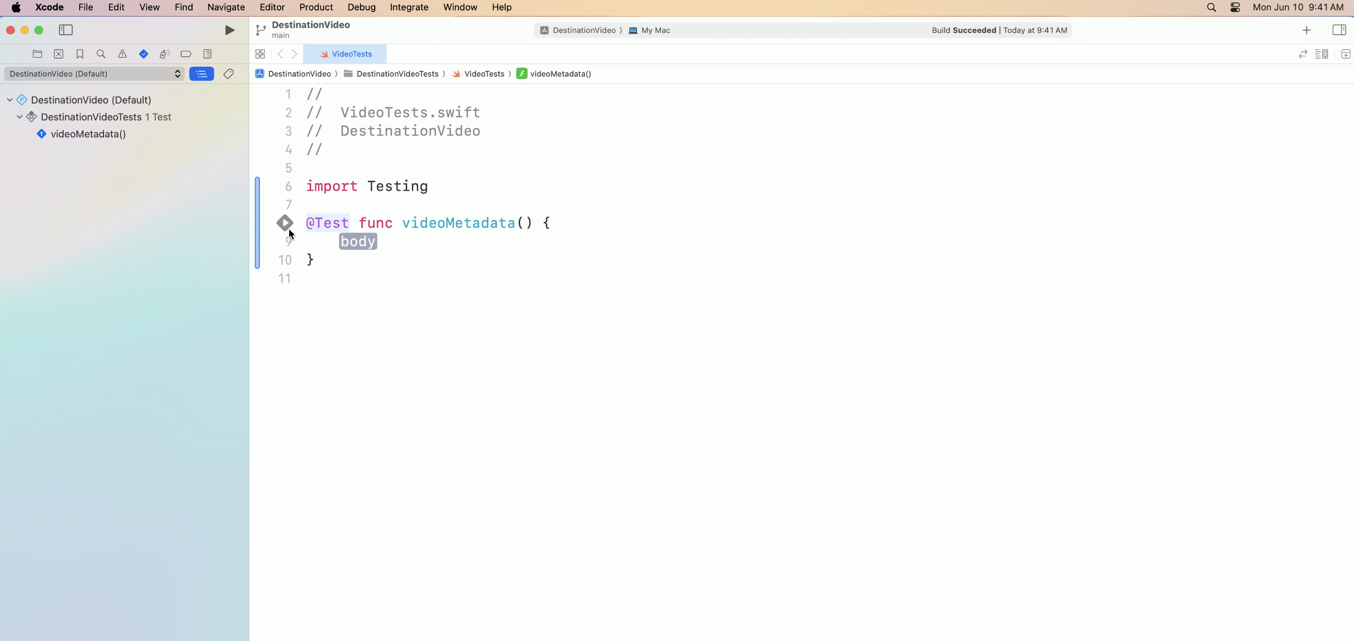 @Test("Check video metadata") func videoMetadata() {