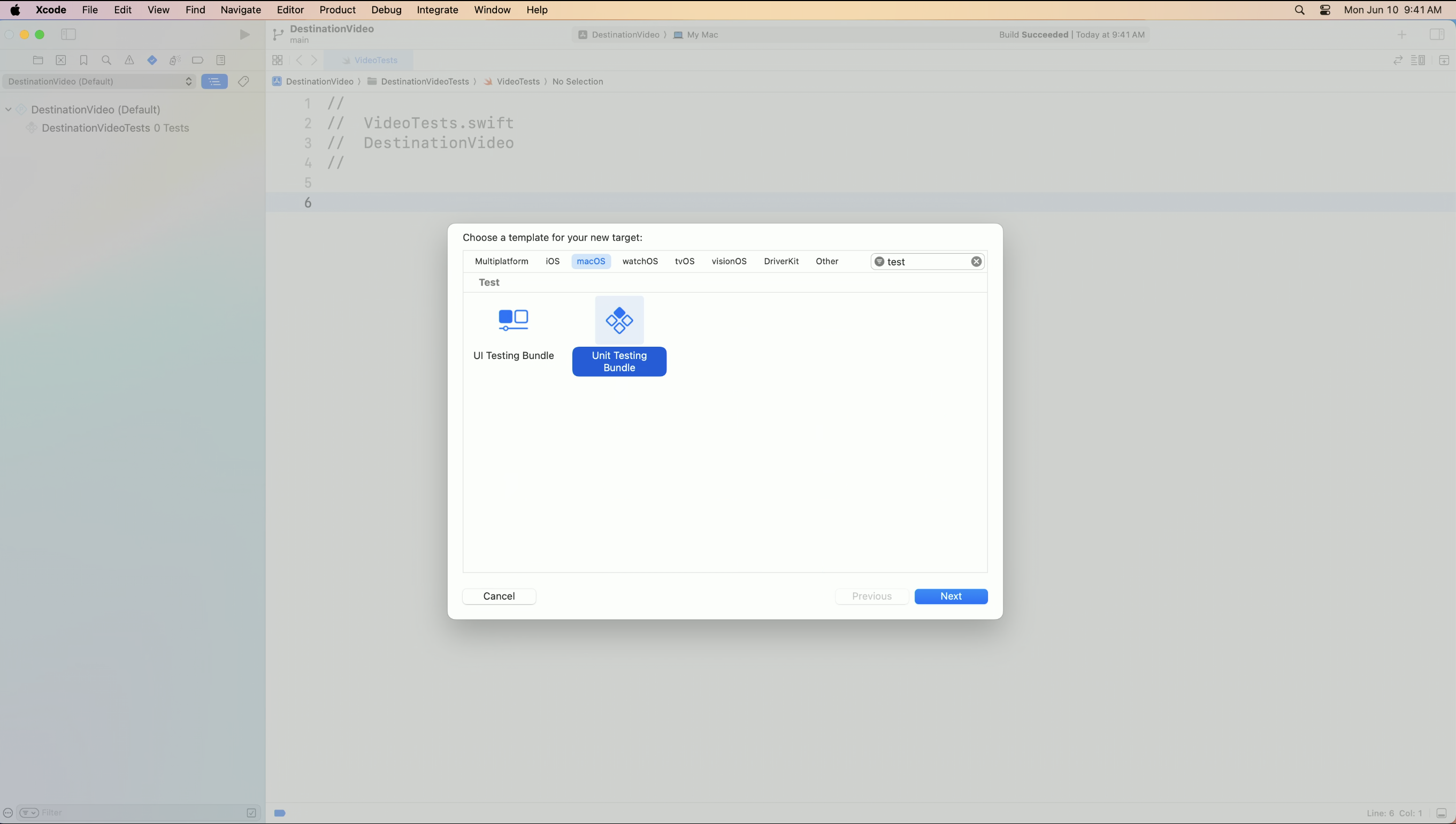 앱에 대한 테스트를 작성해 본 적이 없다면 먼저 프로젝트에 테스트 번들 대상을 추가해줘야 합니다.