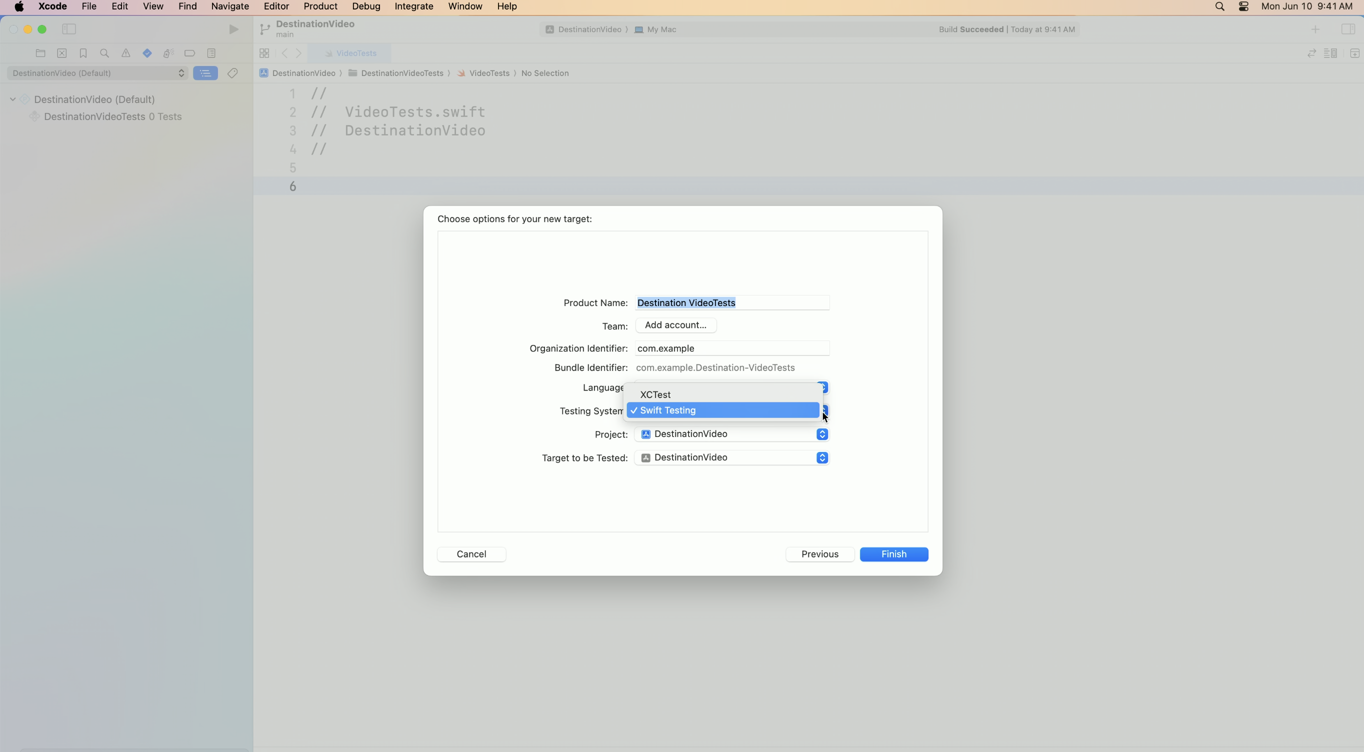 앱에 대한 테스트를 작성해 본 적이 없다면 먼저 프로젝트에 테스트 번들 대상을 추가해줘야 합니다.