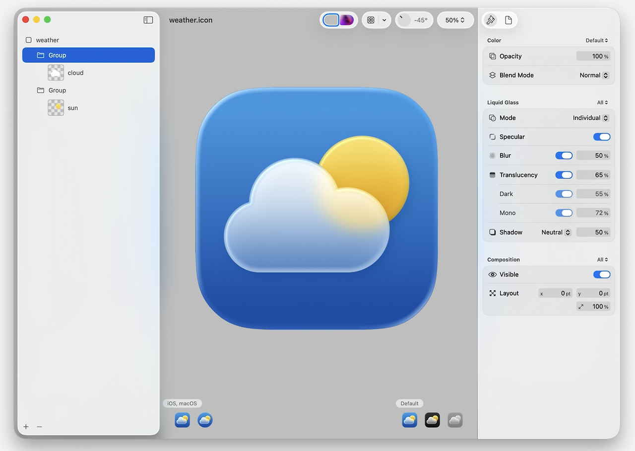 Icon Composer라는 새로운 앱이 번들에 포함되었습니다. 단일 파일에서 모든 플랫폼용 아이콘을 만들 수 있고, 다크 모드나 동적 효과까지 지원합니다.