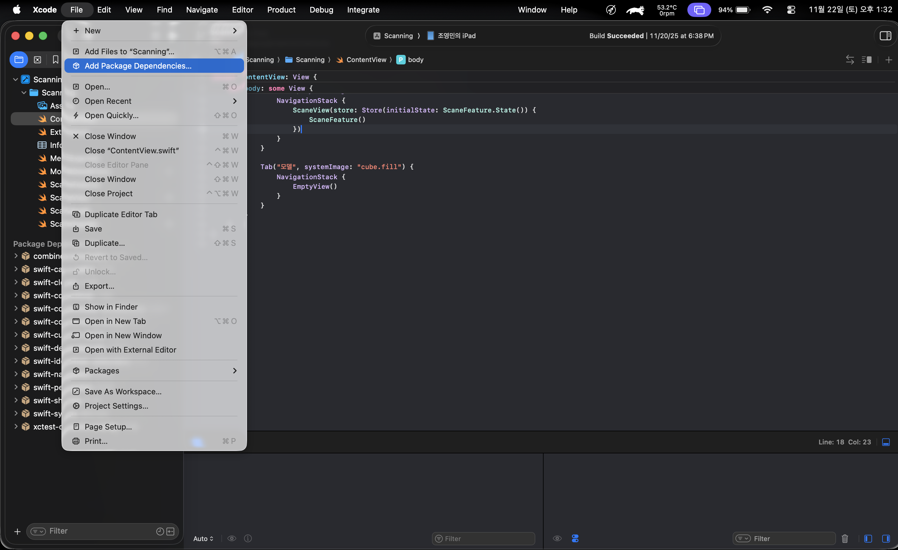 우선 Xcode에서 프로젝트 파일을 만들었다면 아래 화면처럼 File > Add Package Dependencies 를 눌러줍니다.