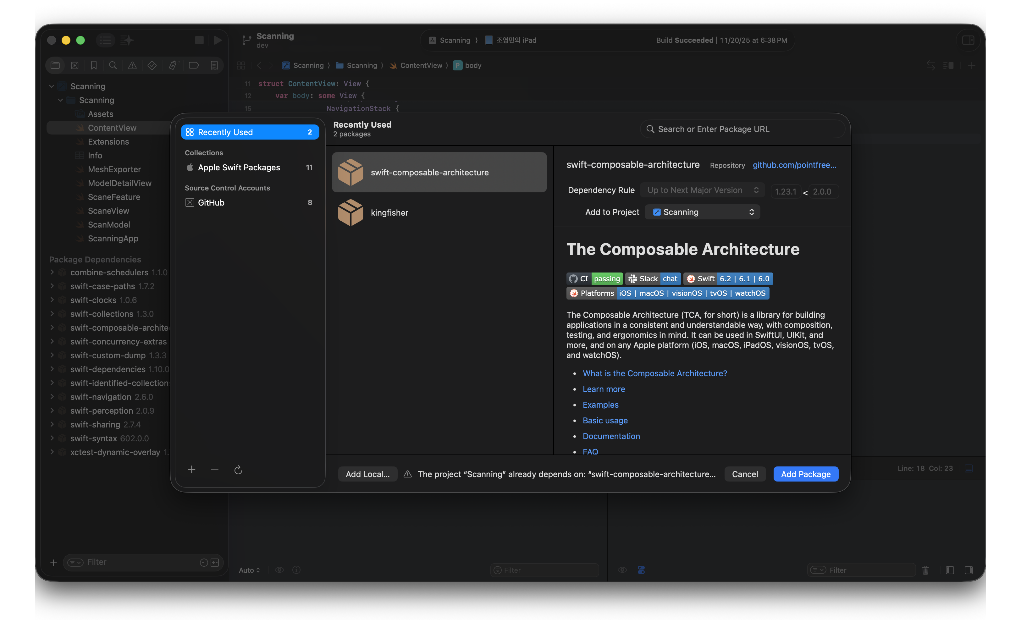 그리고 나서 오른쪽 상단 검색창에 swift-composable-architecture를 검색하고 오른쪽 하단에 Add Package 버튼을 눌러서 적용해주시면 됩니다!