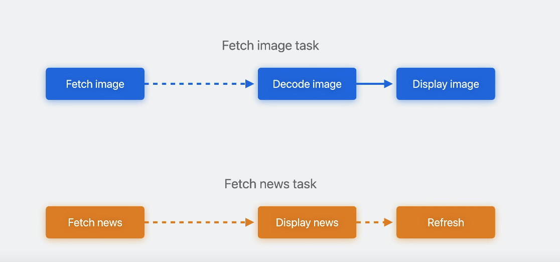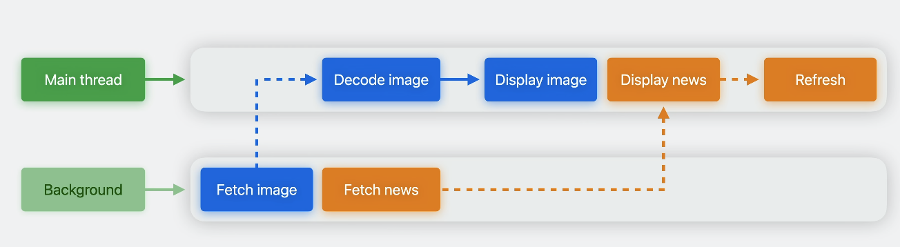 앱이 여러 개의 독립적인 연산을 동시에 수행해야 할 때는 여러 개의 비동기 작업이 유리한데 이 부분은 다음 포스팅에서 다루도록 하겠습니다!
