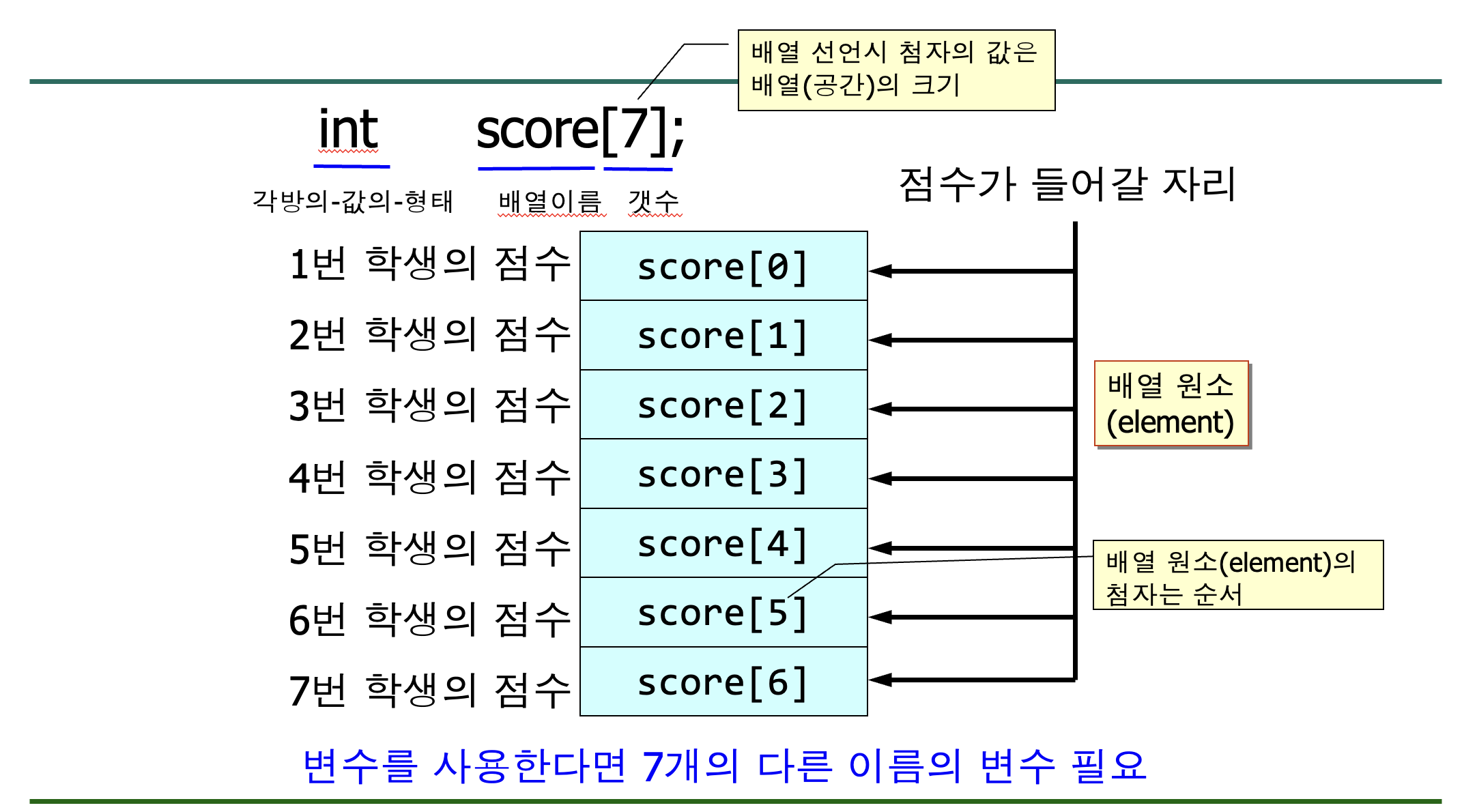- score배열은 정수형 자료 7개를 저장할 수 있다.