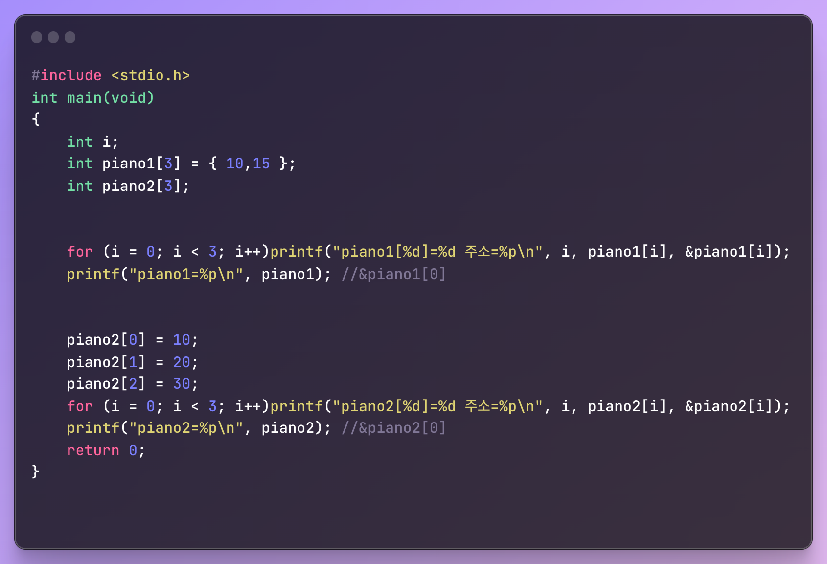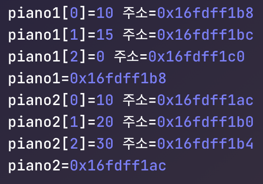 - piano1의 값과 piano1의 시작 주소가 서로 같기 때문에 배열의 이름은 그 배열의 시작 주소이다.