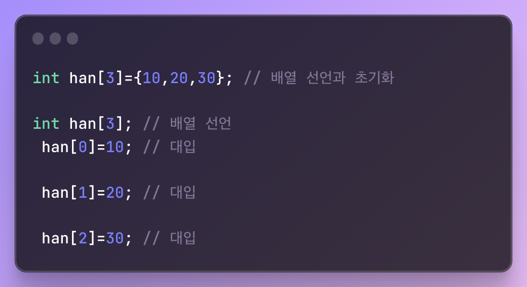 - 배열 선언문에서 사용하는 첨자는 양의 정수이며 배열의 크기이다.