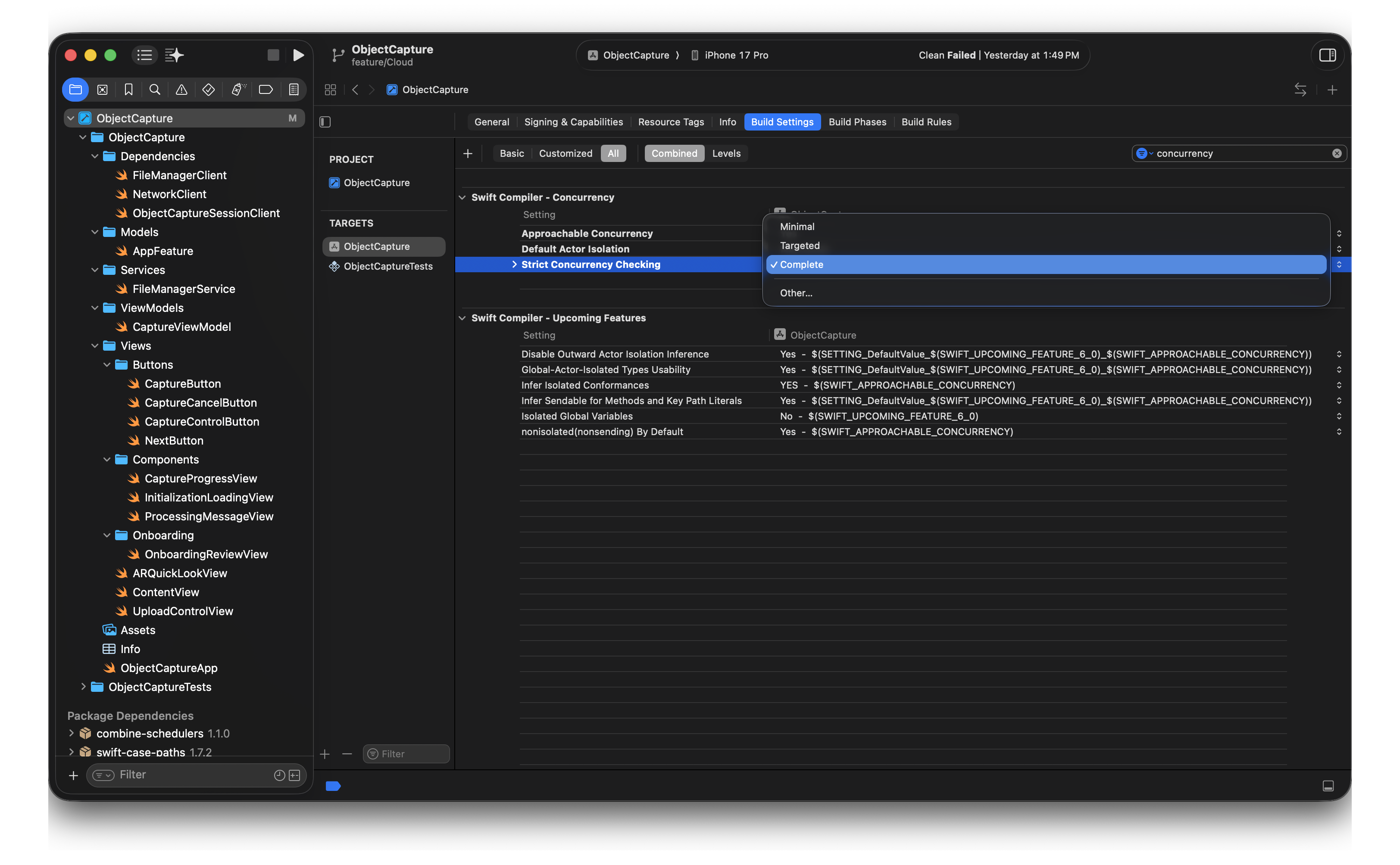 프로젝트를 선택하고 Targets에서 Build Settings에 들어간 뒤, Strict Concurrency Checking을 찾아줍니다.