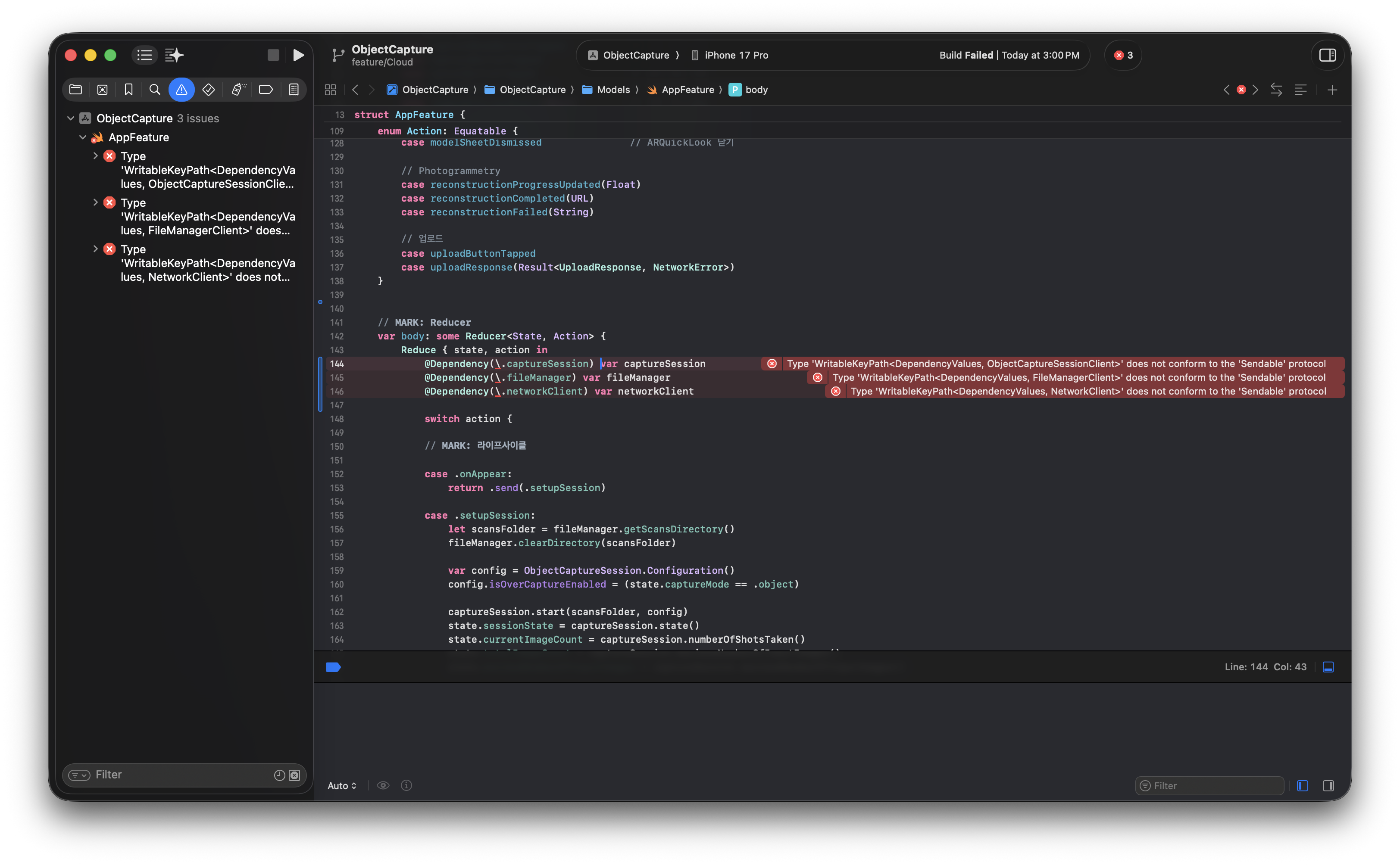 Type 'WritableKeyPath<DependencyValues, ObjectCaptureSessionClient>' does not conform to the 'Sendable' protocol; this is an error in the Swift 6 language mode