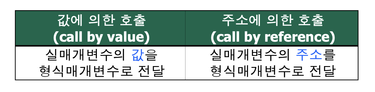 -실매개변수의 값을 형시매개변수로 전달 (이 방법은 실매개변수를 형식매개변수로 전달할 뿐 함수 내부에서 형식매개변수가 변경되더라도 실매개변수는 변경되지 않는다.)