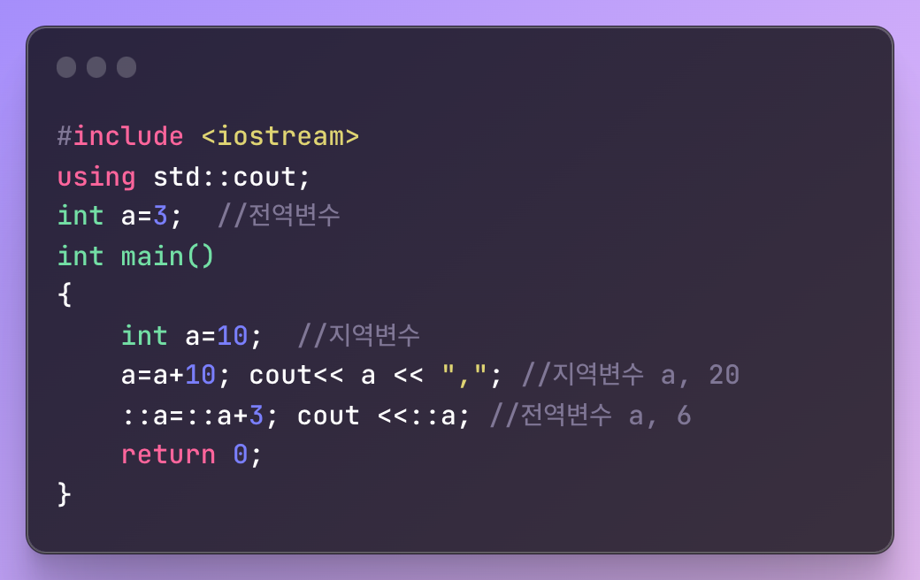 • ::을 사용했기 때문에 8행에 존재하는 a는 블록({ }) 안에 있는 지역변수 a를 뜻하는 것이 아니라 블록 밖에 있는 전역 변수 a를 뜻하게 된다.