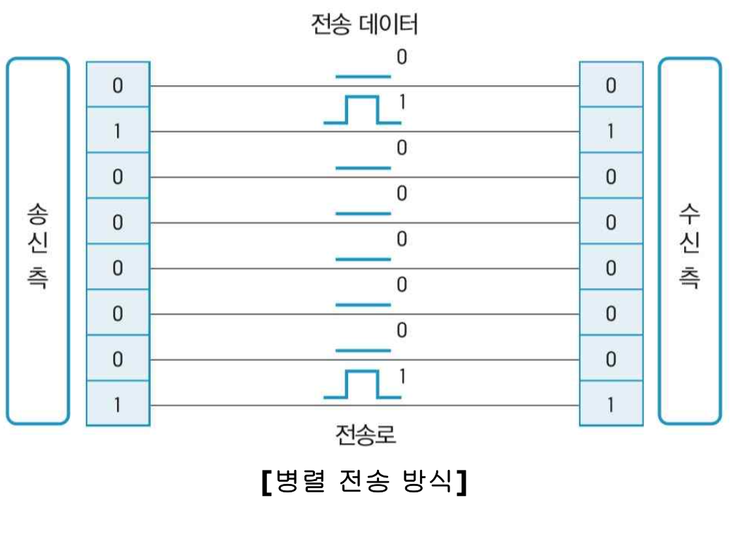 - 여러 개의 전송로 (또는 채널)을 통해 한 번에 기본 단위의 데이터를 전송하는 방식이다.