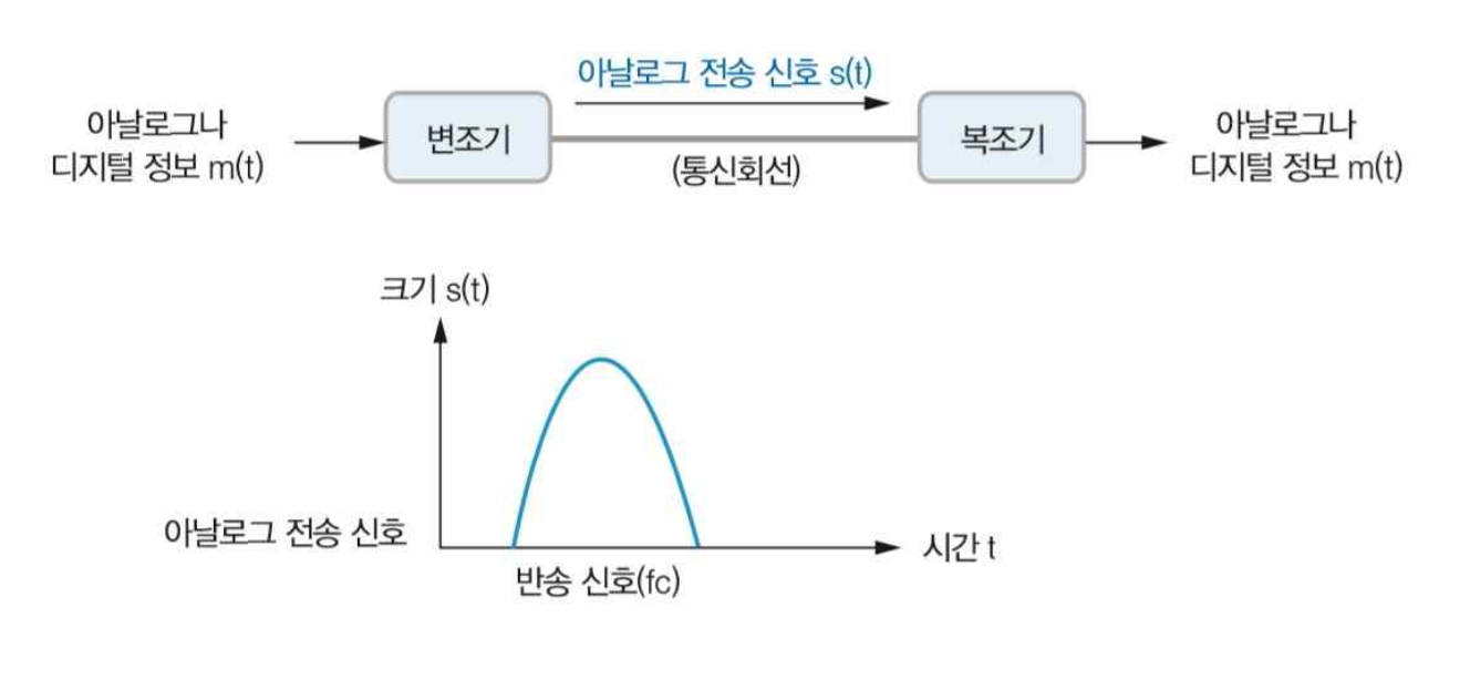 - 아날로그나 디지털 정보를 변조기를 이용하여 아날로그 전송 신호로 변환하여 전송한다.