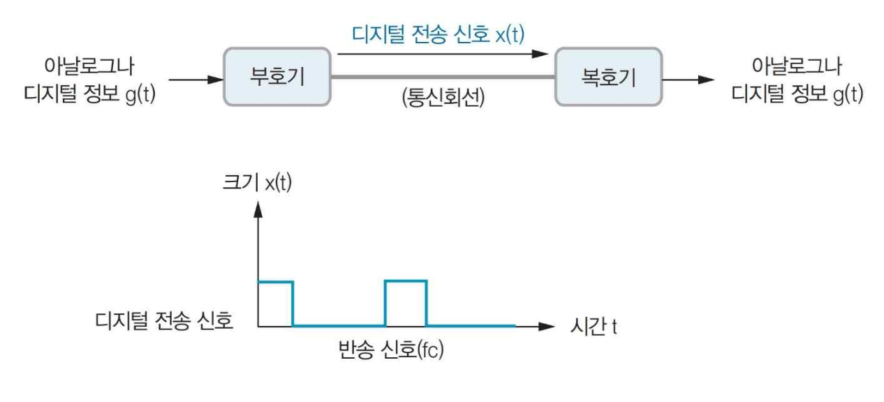 - 아날로그나 디지털 정보를 부호기를 이용해 디지털 전송 신호롤 변환해 전송한다.