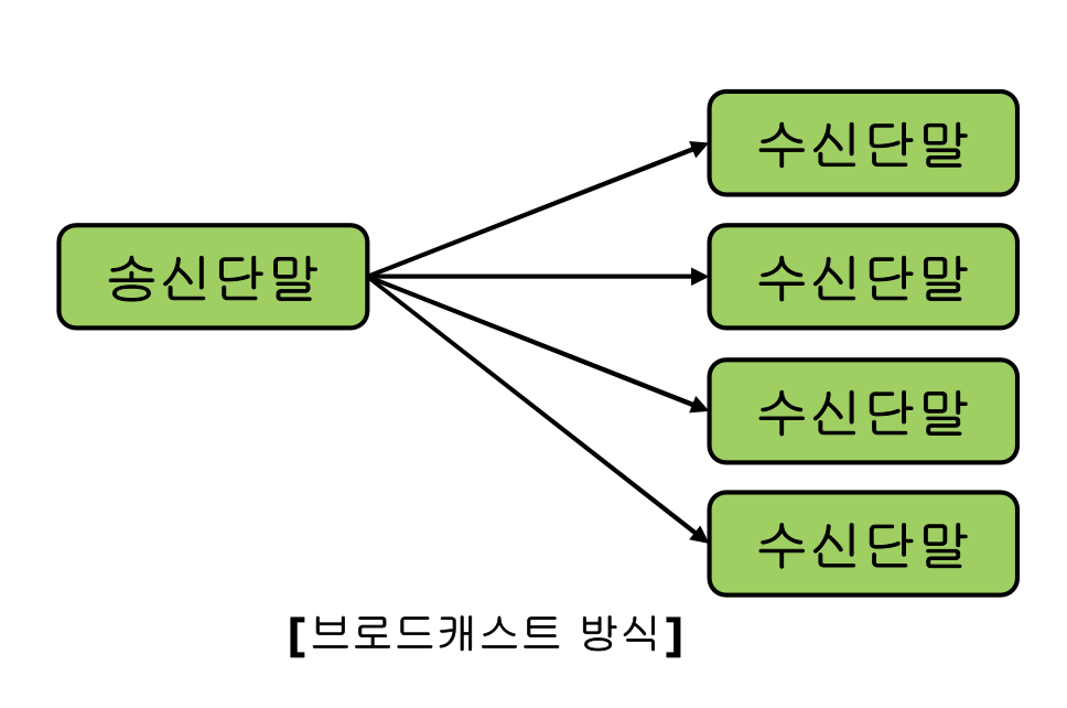 - 송신 노드 하나가 동일한 네트워크에 연결된 수신 가능한 모든 노드에 데이터를 전송하는 방식이다.