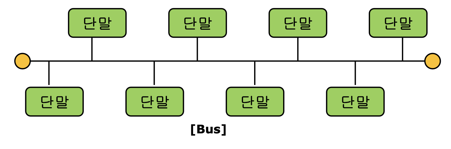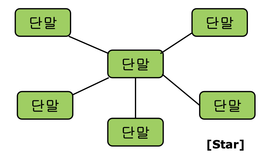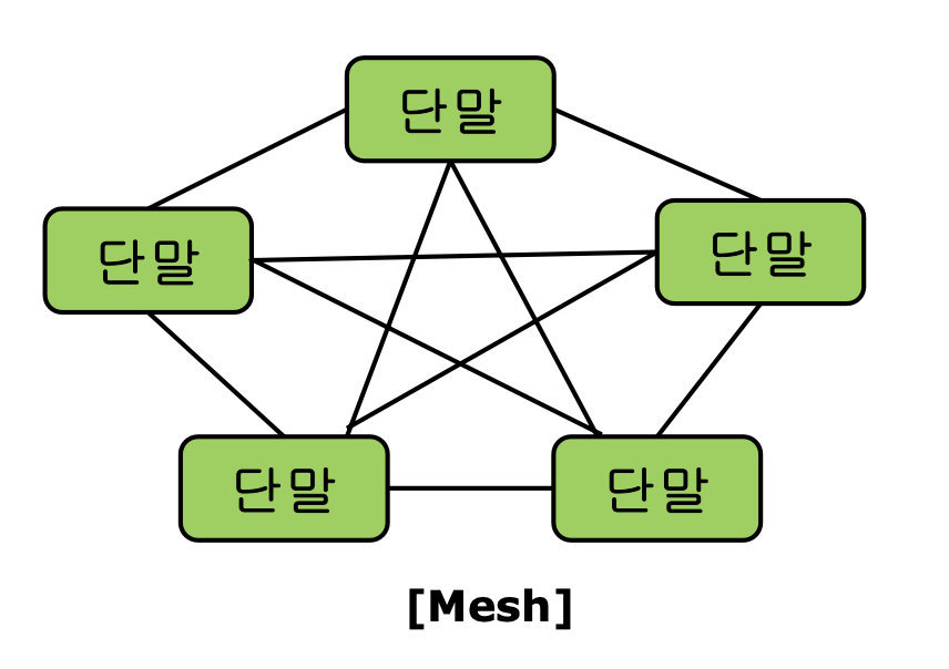 - 단점은 네트워크 구성의 변경이 어렵고 회선에 장애 발생 시 전체 네트워크를 사용할 수 없다.