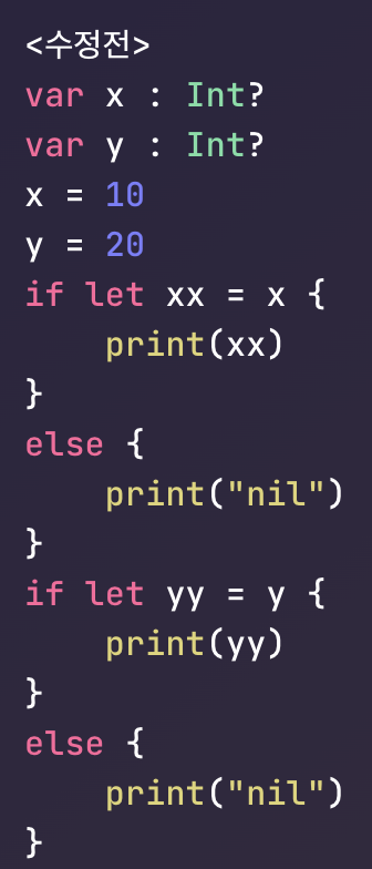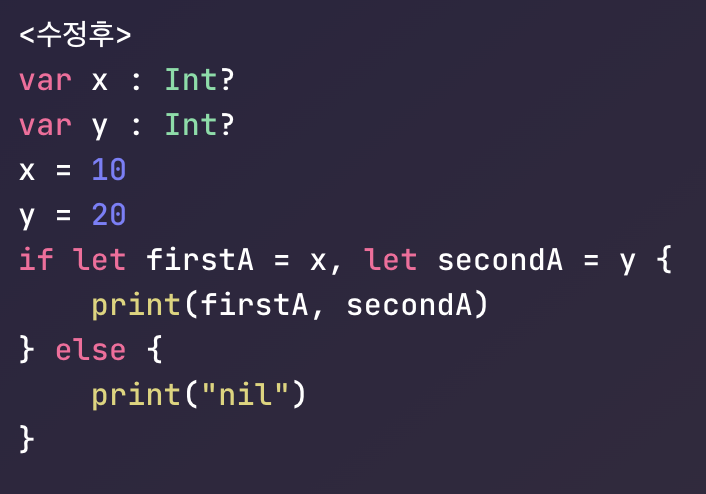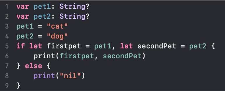 - 여러 옵셔널 변수를 한 번에 언래핑을 할 수 있다.