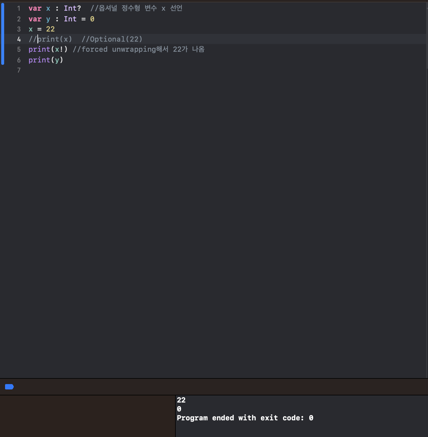 - 옵셔널 타입 변수를 선언하기 위해서는 타입 선언부 뒤에 "?" 문자를 사용한다.