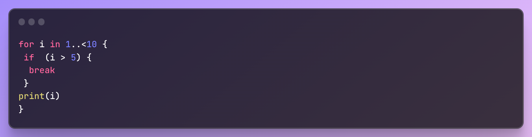- 현재의 반복문에서 빠져나와서 반복문 바로 다음에 있는 코드를 실행한다.