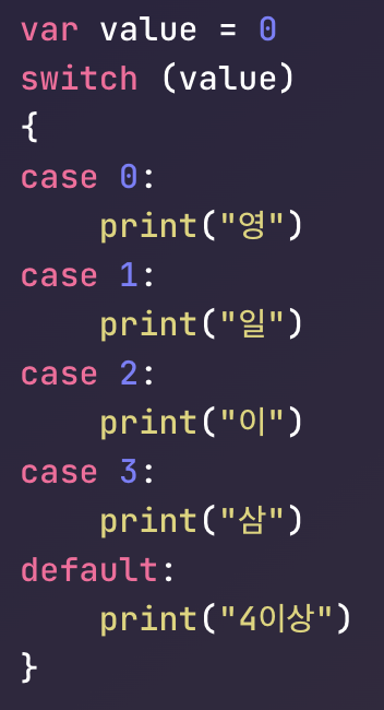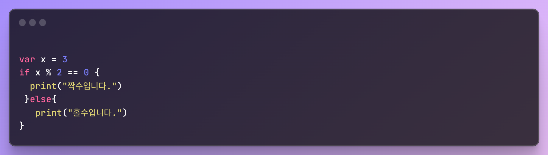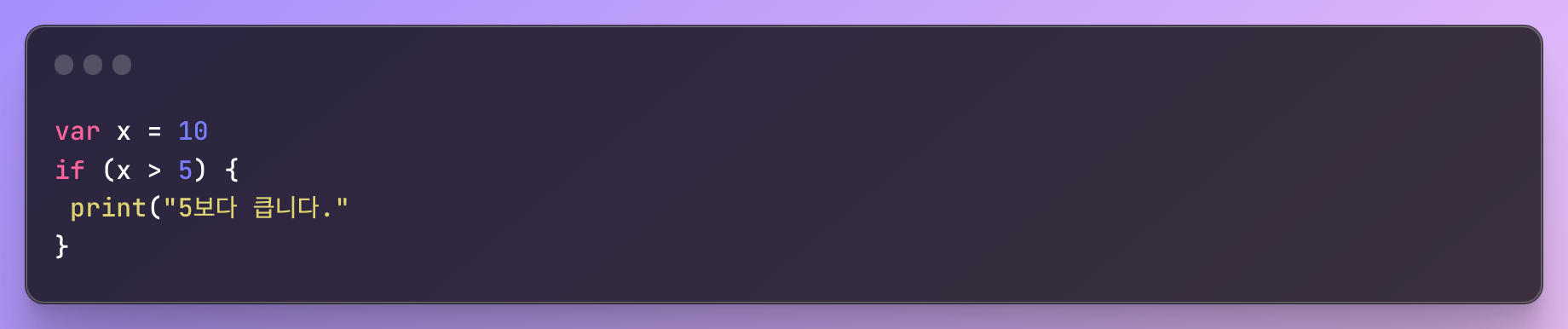 - 다른 프로그래밍 언어들과는 다르게, 스위프트에서는 if문 다음의 실행 코드가 한 줄이라도 괄호({ })를 필수적으로 사용해야 한다.