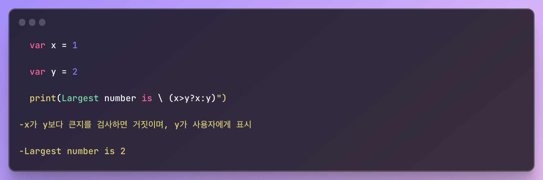 - 비교 연산을 빠르게 하기 위해 삼항 연산자(ternary operator)를 지원