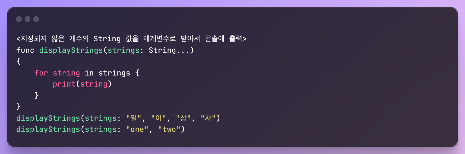 - 함수가 지정된 데이터 타입으로 0개 또는 그 이상의 매개변수를 받는다는 것을 가리키기 위해서 세 개의 점(...)을 이용하여 선언한다.