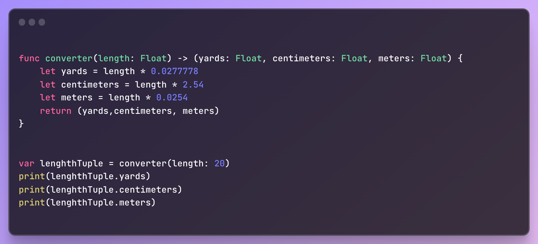 - 인치 단위의 수를 매개변수로 받아 야드, 센티미터, 미터로 반환하고 이 세 개의 값을 하나의 튜플에 넣어 반환한다.