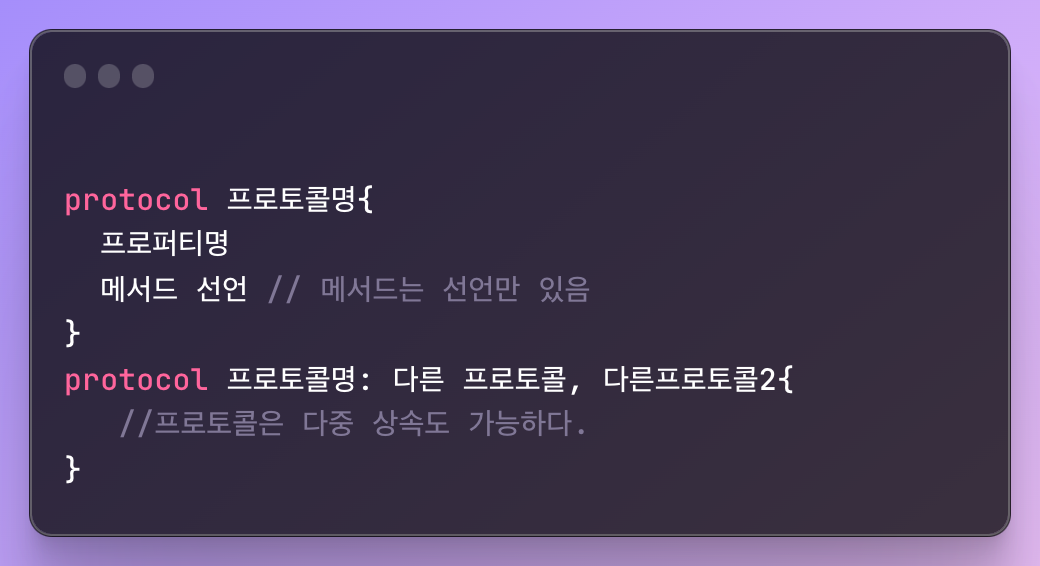 - class 클래스명:프로토콜명1, 프로토콜명2{ }