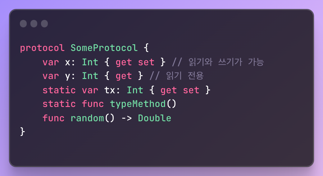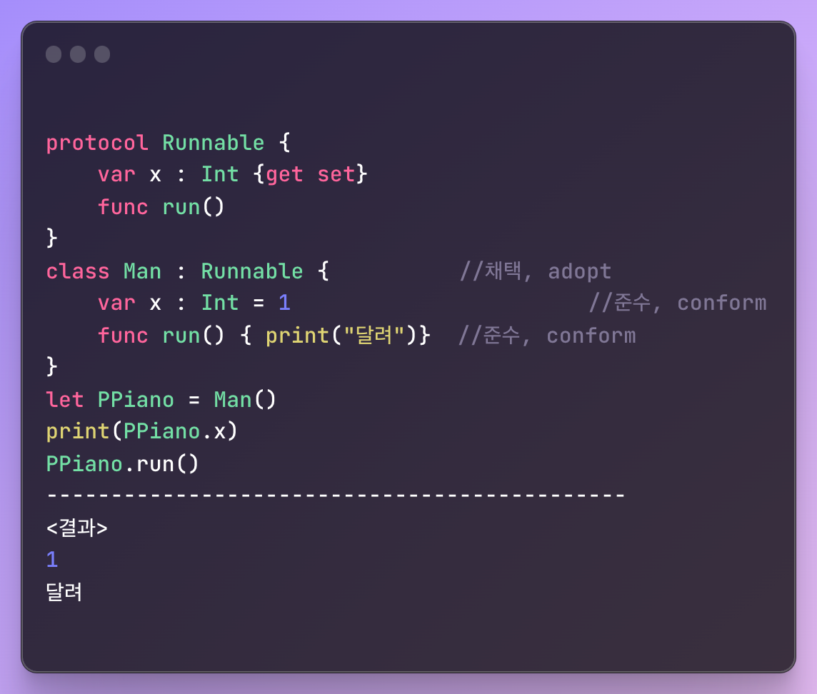 - 클래스, 구조체, 열거형, extension에 프로토콜을 채택(adopt)할 수 있다.