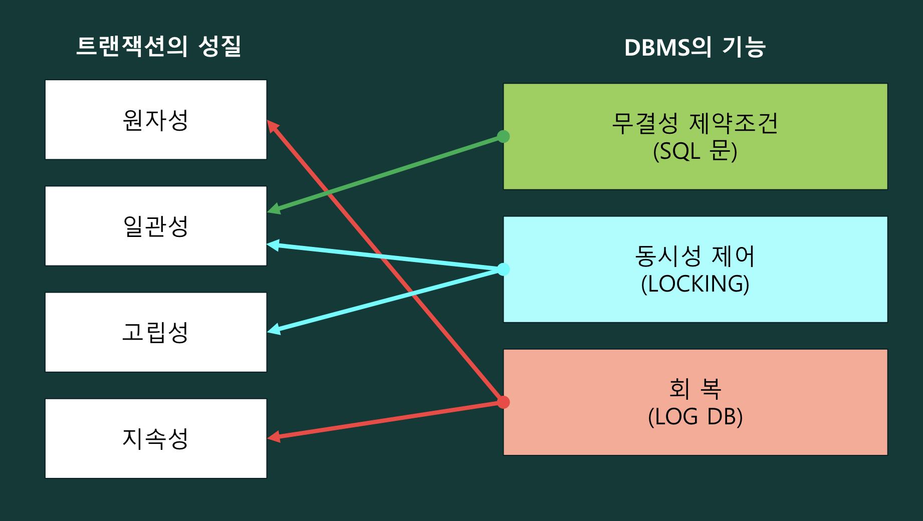 - 특징으로는 원자성, 일관성, 독립성, 지속성이 있다.